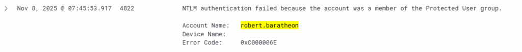 For sevenkingdoms.local\robert.baratheon, seems password is valid but we get STATUS_ACCOUNT_RESTRICTION, the reason for this is that, although the password is valid, we cannot use NTLM authentication because robert.baratheon is in the Protected Users security group.