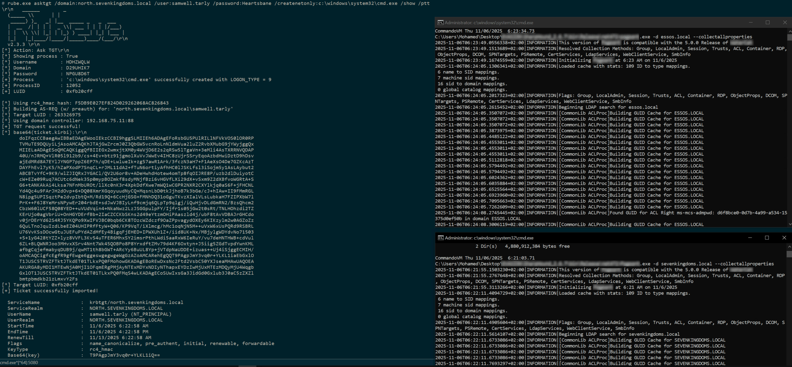 rubeus.exe asktgt /domain:north.sevenkingdoms.local /user:samwell.tarly /password:Heartsbane /createnetonly:c:\windows\system32\cmd.exe /show /pttThen in the window with valid Kerberos ticket, we can run SharpHound once for each domain